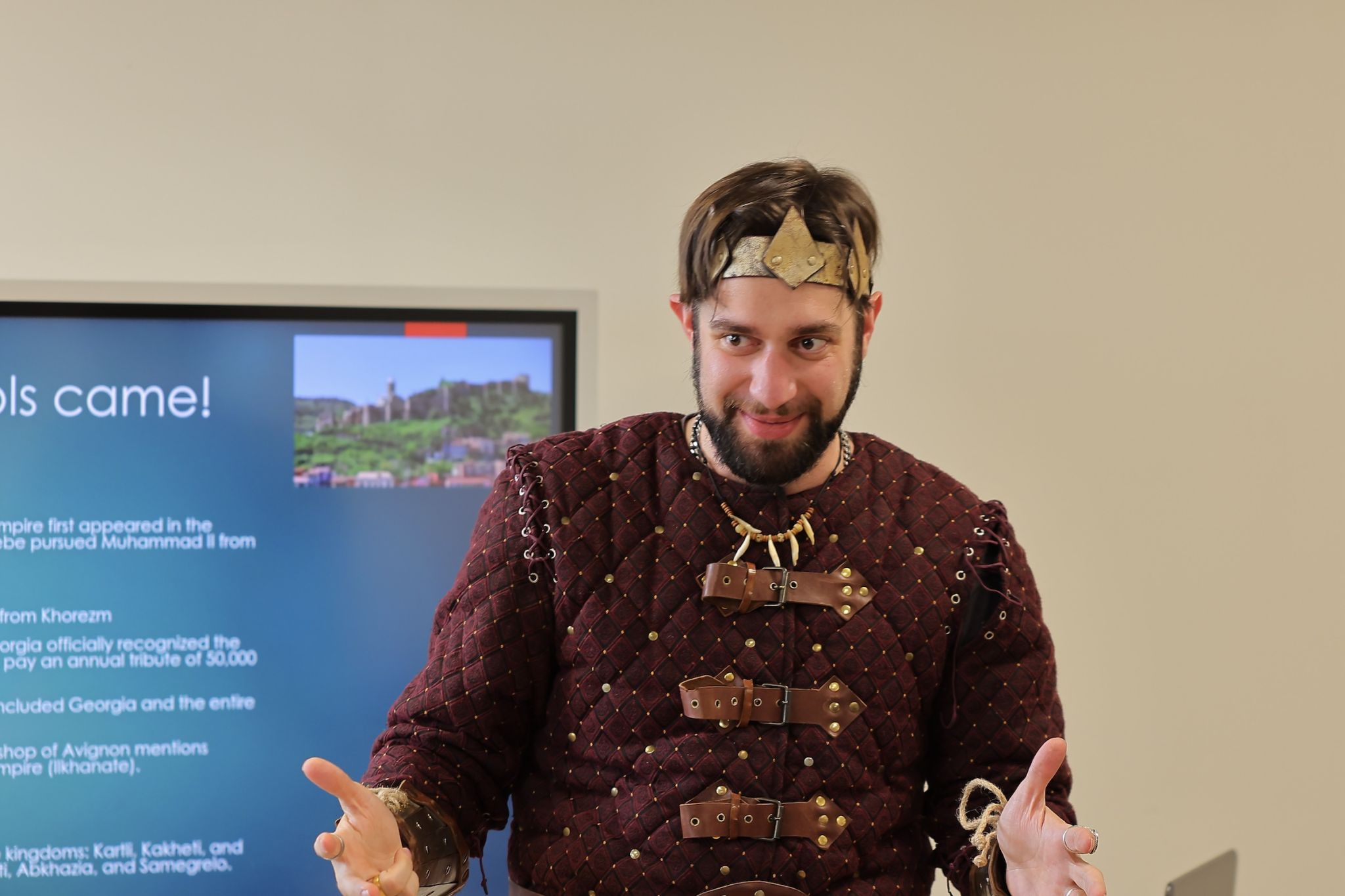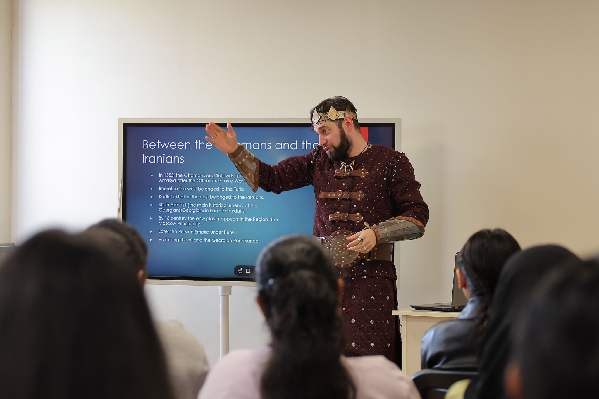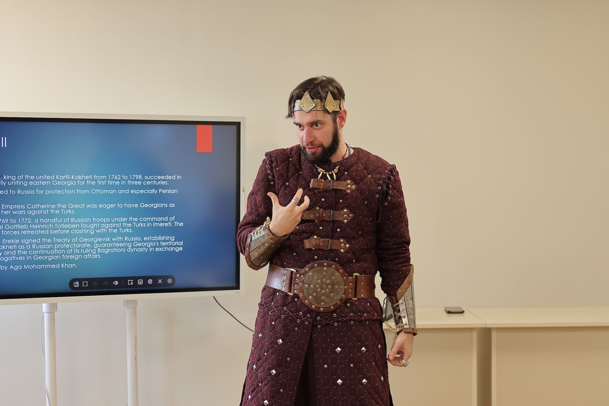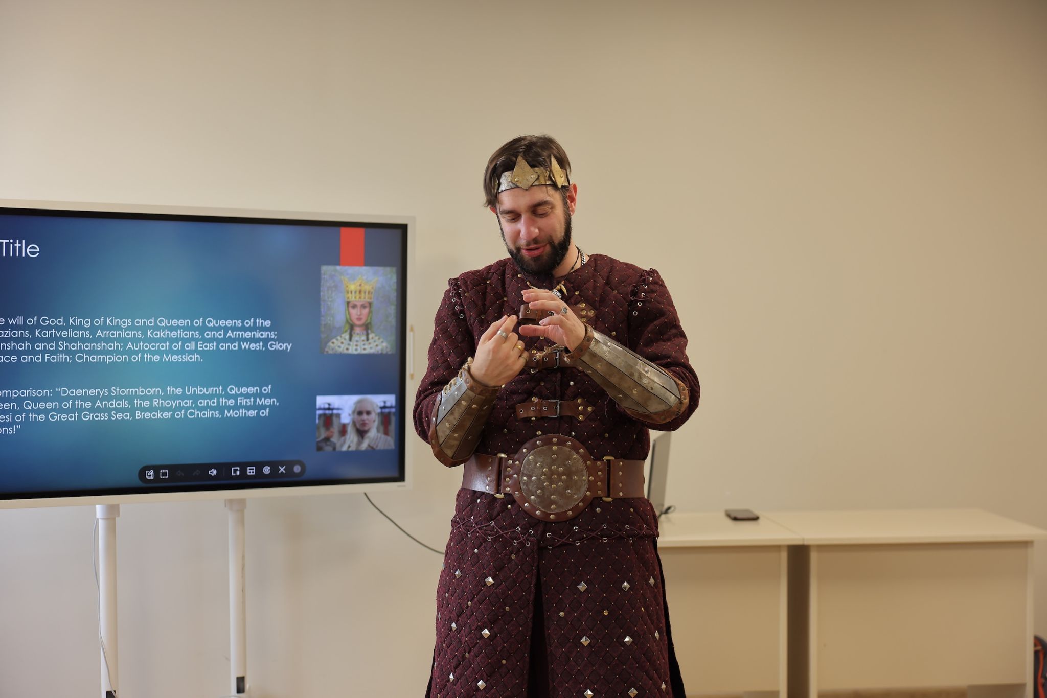 For this special occasion, Professor Kurdashvili wore a royal costume designed specifically for his first lecture with the students, adding a distinctive charm, emotional depth, and impressive atmosphere to the event. (The armor was created by costume reconstructor Akaki Makatsaria.)