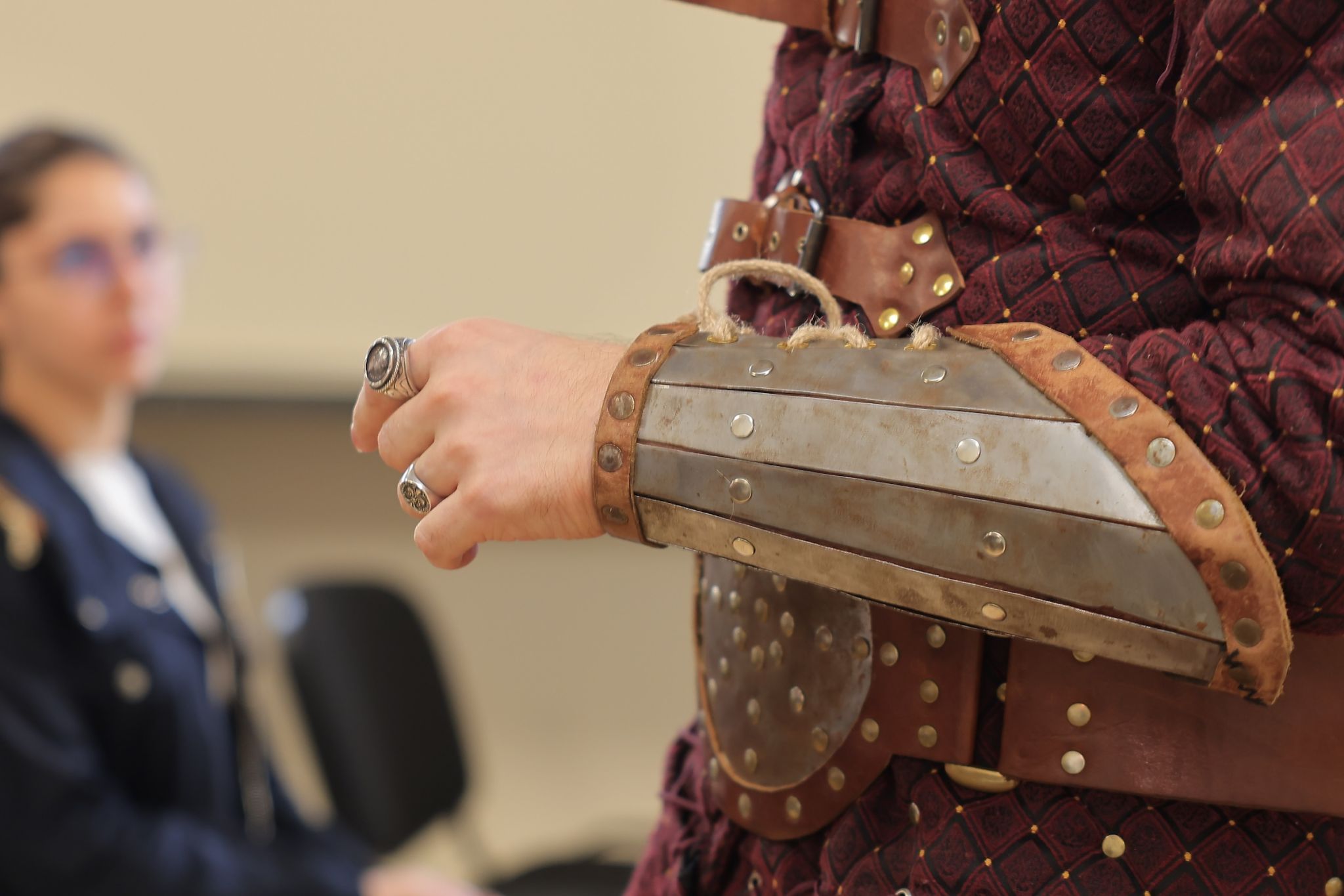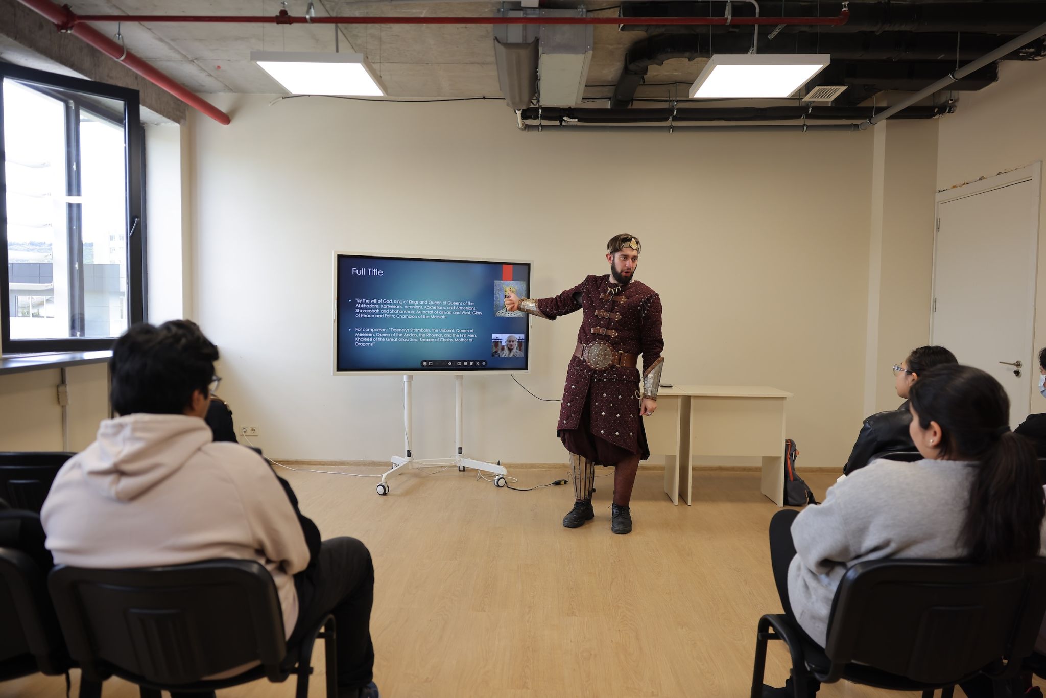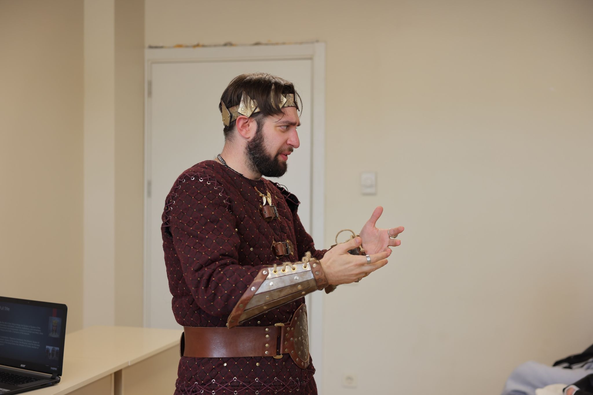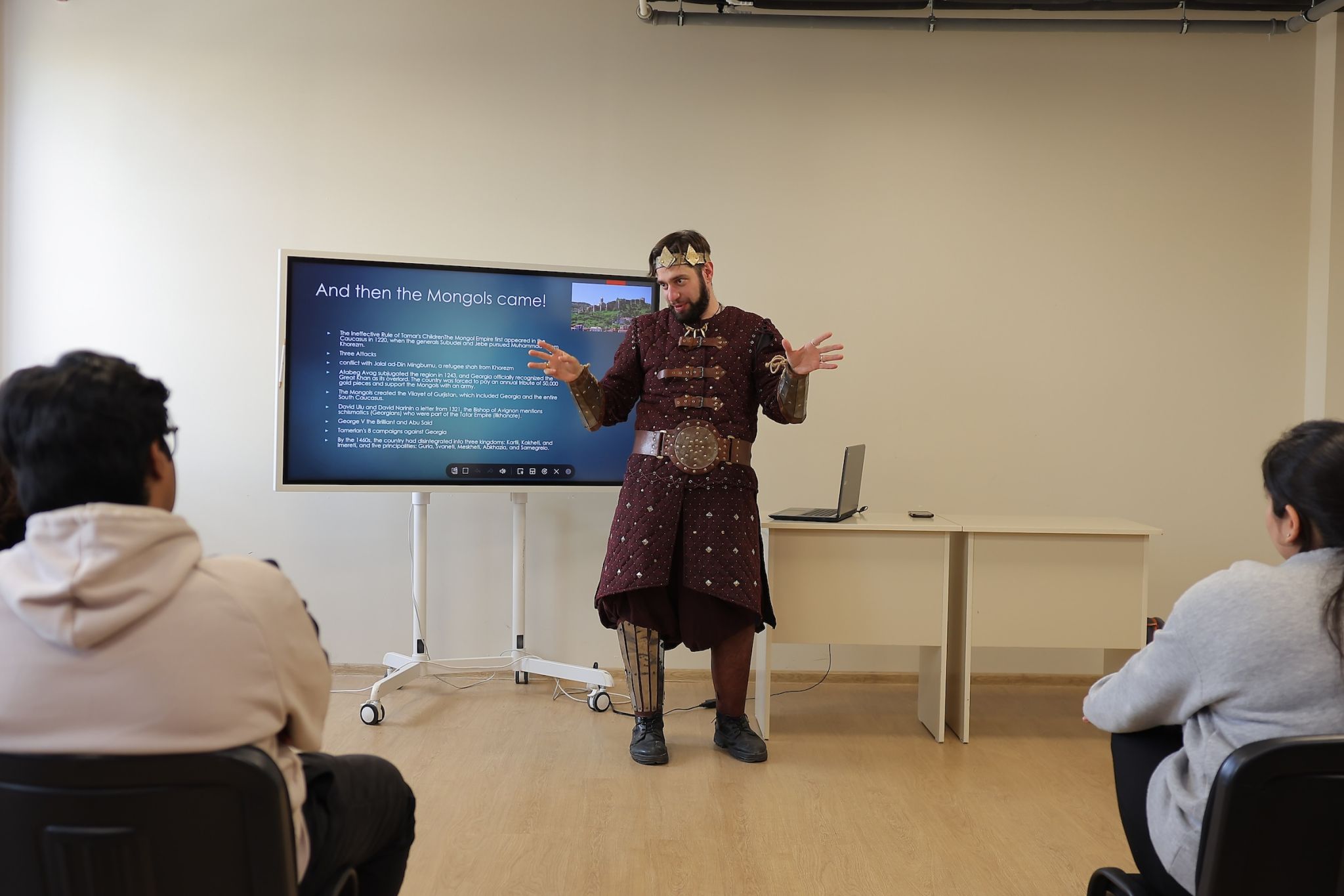 For this special occasion, Professor Kurdashvili wore a royal costume designed specifically for his first lecture with the students, adding a distinctive charm, emotional depth, and impressive atmosphere to the event. (The armor was created by costume reconstructor Akaki Makatsaria.)