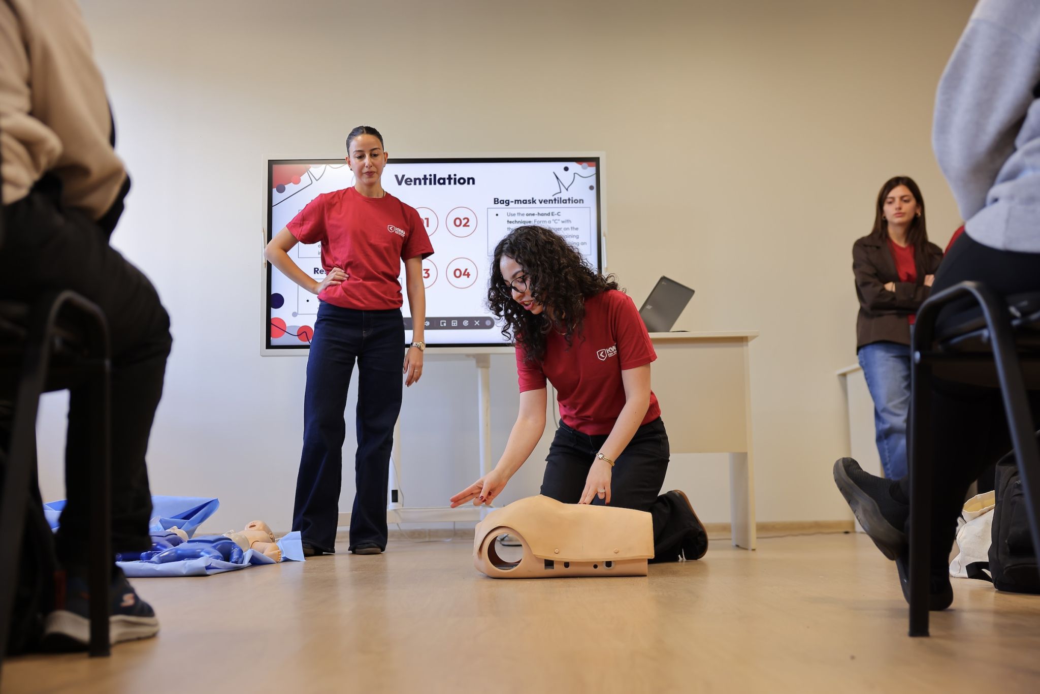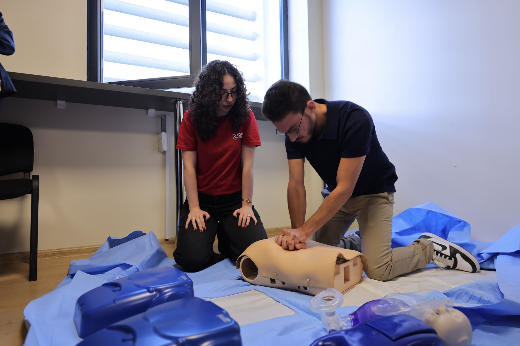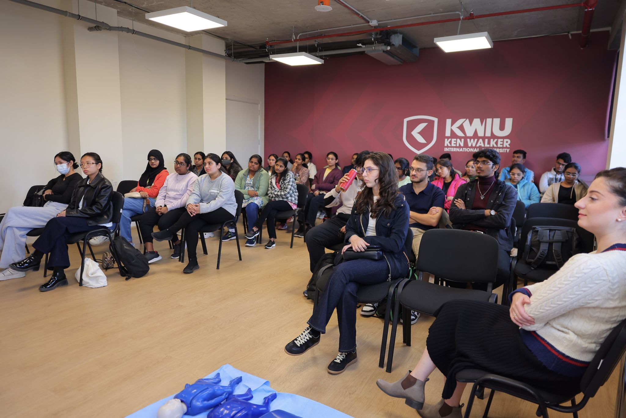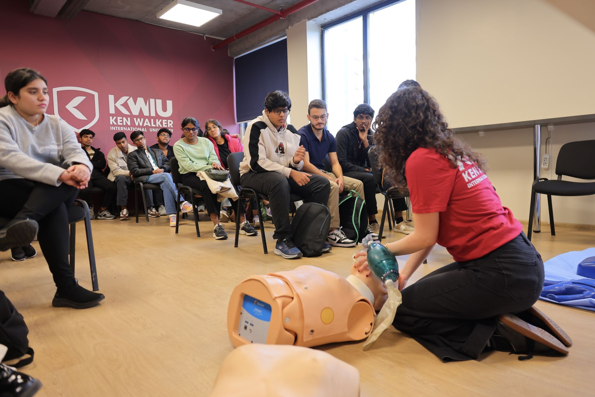 Following this introductory meeting, a hands-on simulation training was conducted. Ken Walker International University instructors guided students through essential steps for responding to an accident and stabilizing a victim until emergency services arrive. During the session, students practiced CPR (cardiopulmonary resuscitation - a lifesaving procedure performed when the heart stops) using medical simulation manikins.
