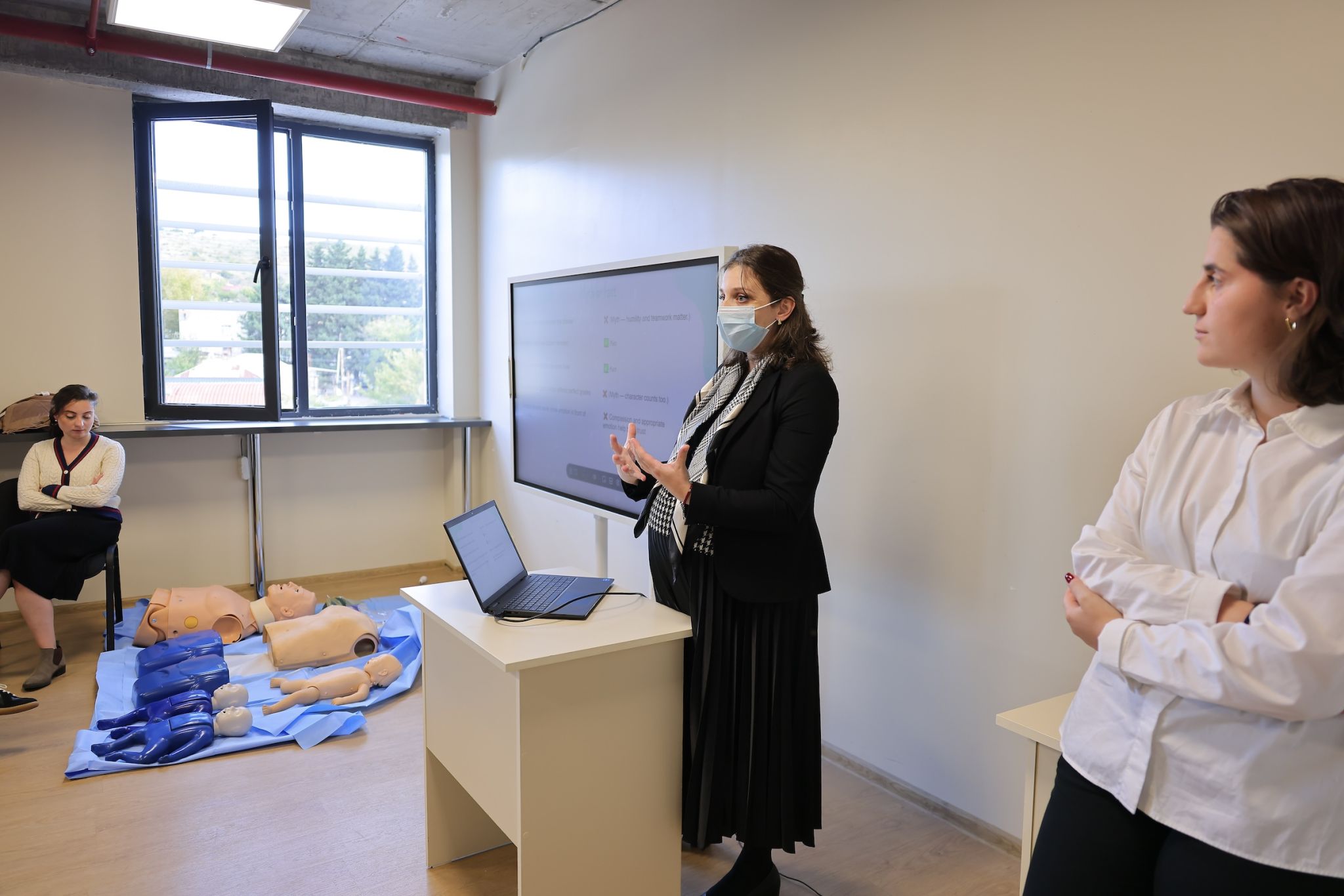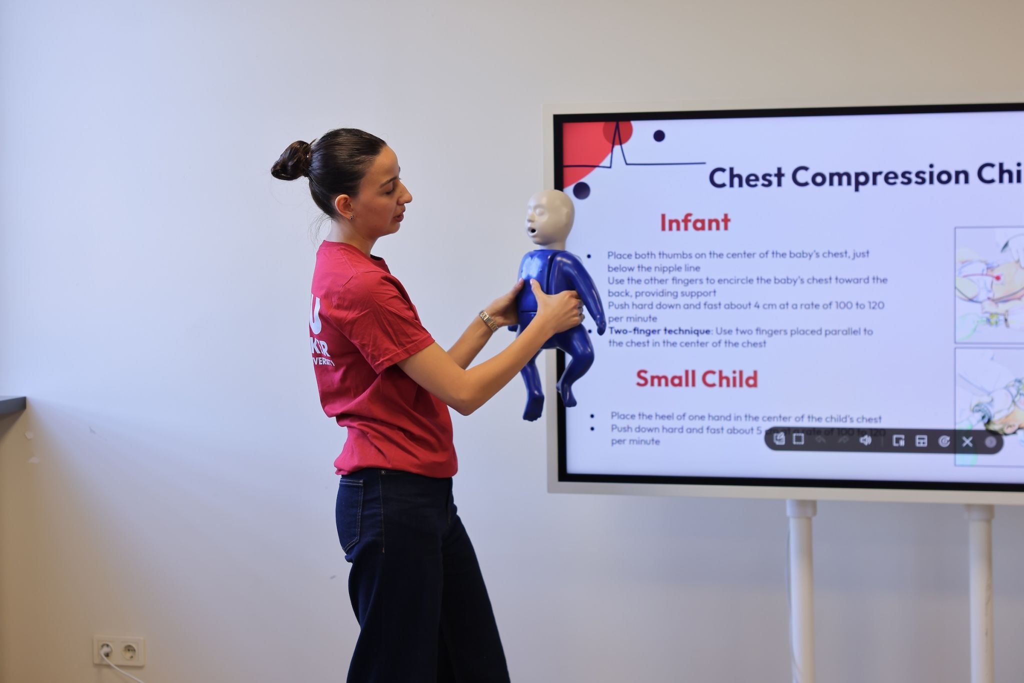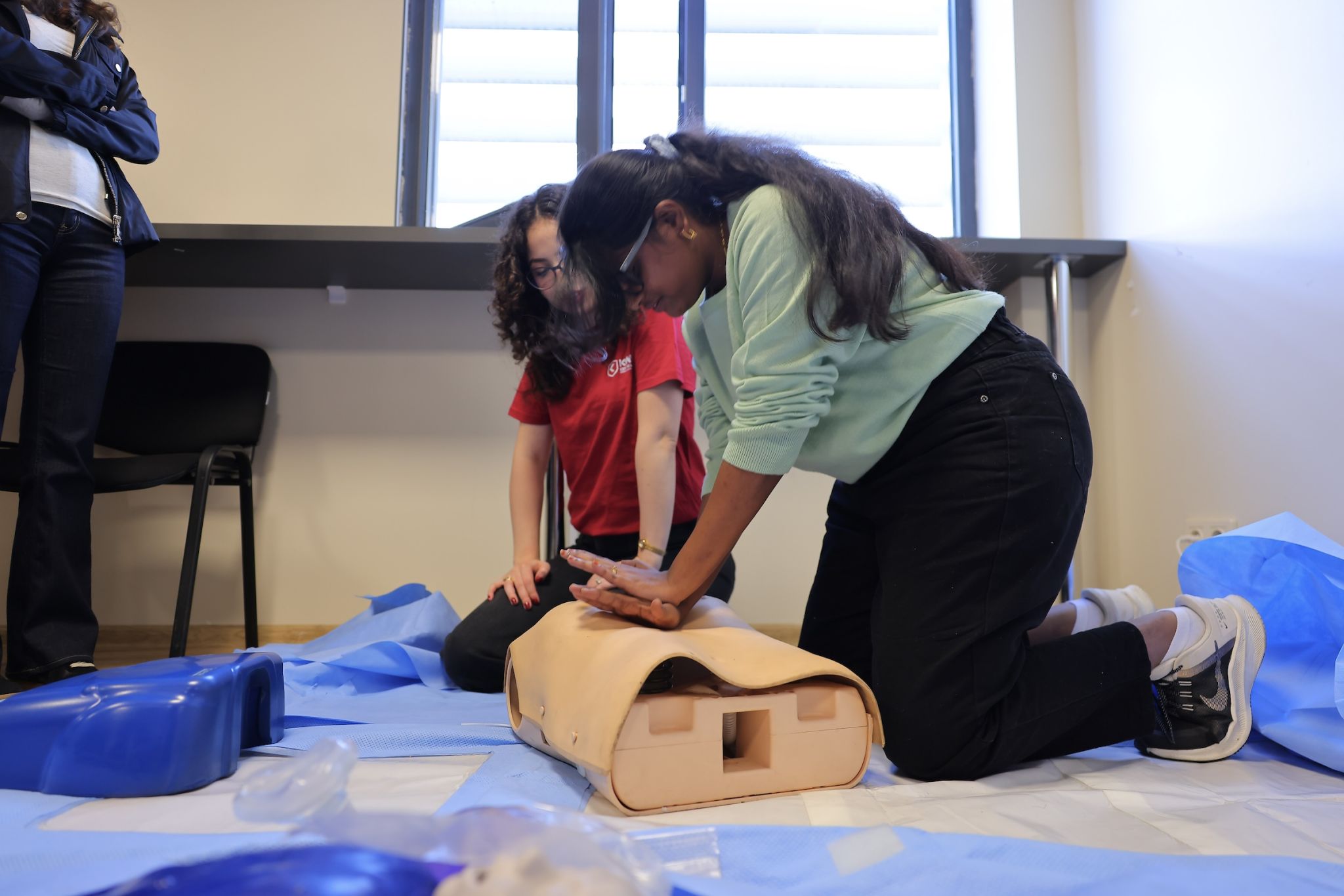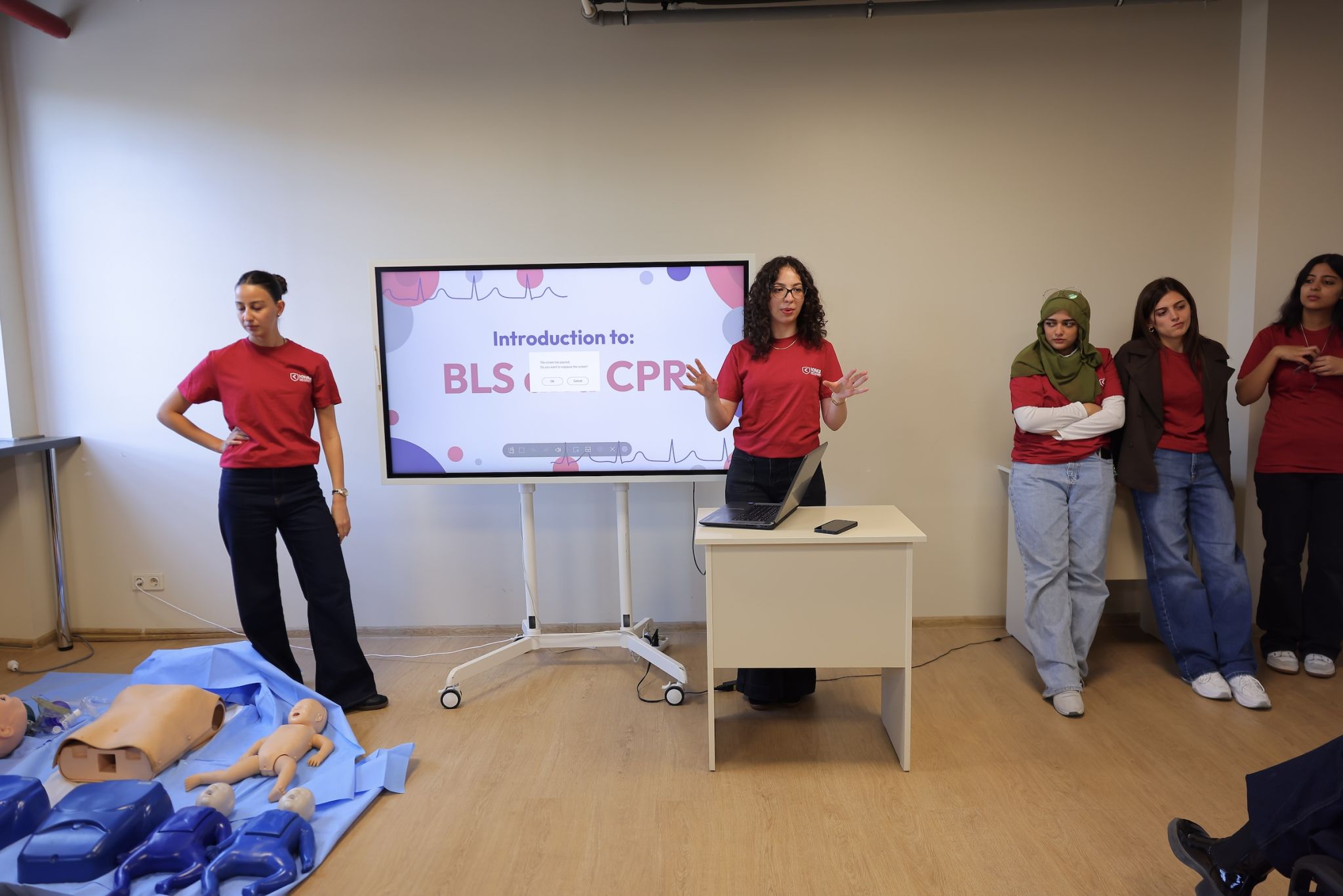 Following this introductory meeting, a hands-on simulation training was conducted. Ken Walker International University instructors guided students through essential steps for responding to an accident and stabilizing a victim until emergency services arrive. During the session, students practiced CPR (cardiopulmonary resuscitation - a lifesaving procedure performed when the heart stops) using medical simulation manikins.