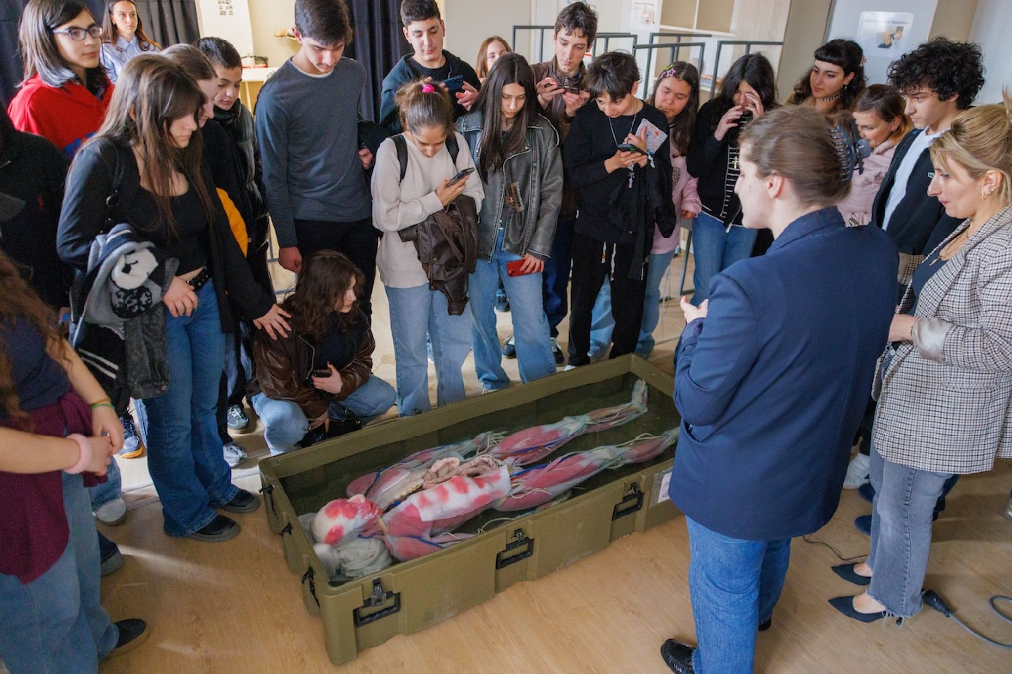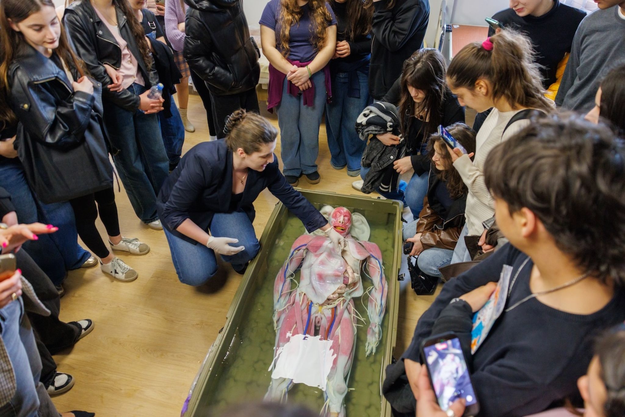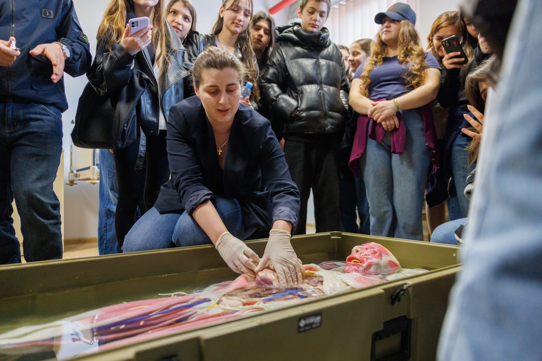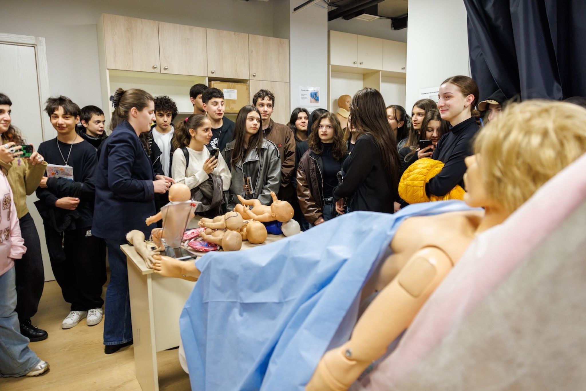 As part of the visit, students toured the Simulation Center, explored modern medical technologies, and experienced a practical learning environment. A key highlight was an advanced anatomical manikin, currently unique in Georgia and exclusively available at KWIU.