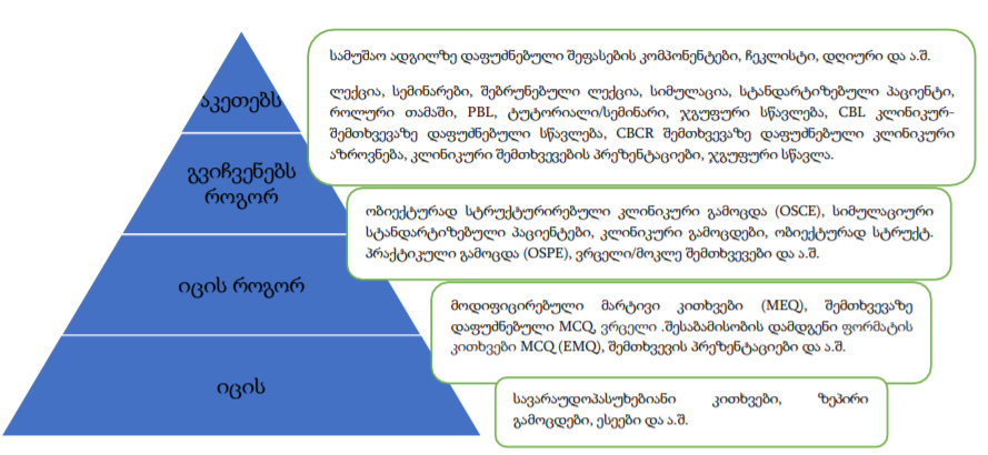 სწავლებისა და შეფასების პროცესში გამოიყენება საერთაშორისოდ აღიარებული ინოვაციური მეთოდები. კლინიკური კომპეტენციების დონეების შესაფასებლად ფართოდ გამოიყენება მილერის პირამიდა.